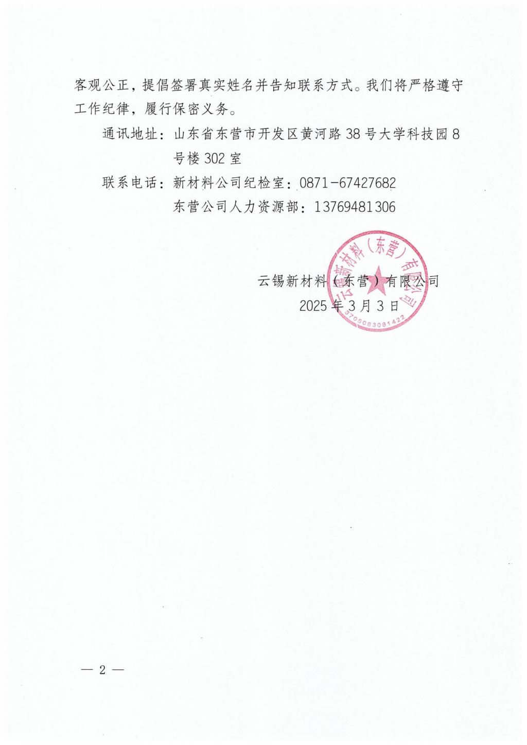 云錫新材料(東營)有限公司2025年度社會招聘擬錄用人員公示