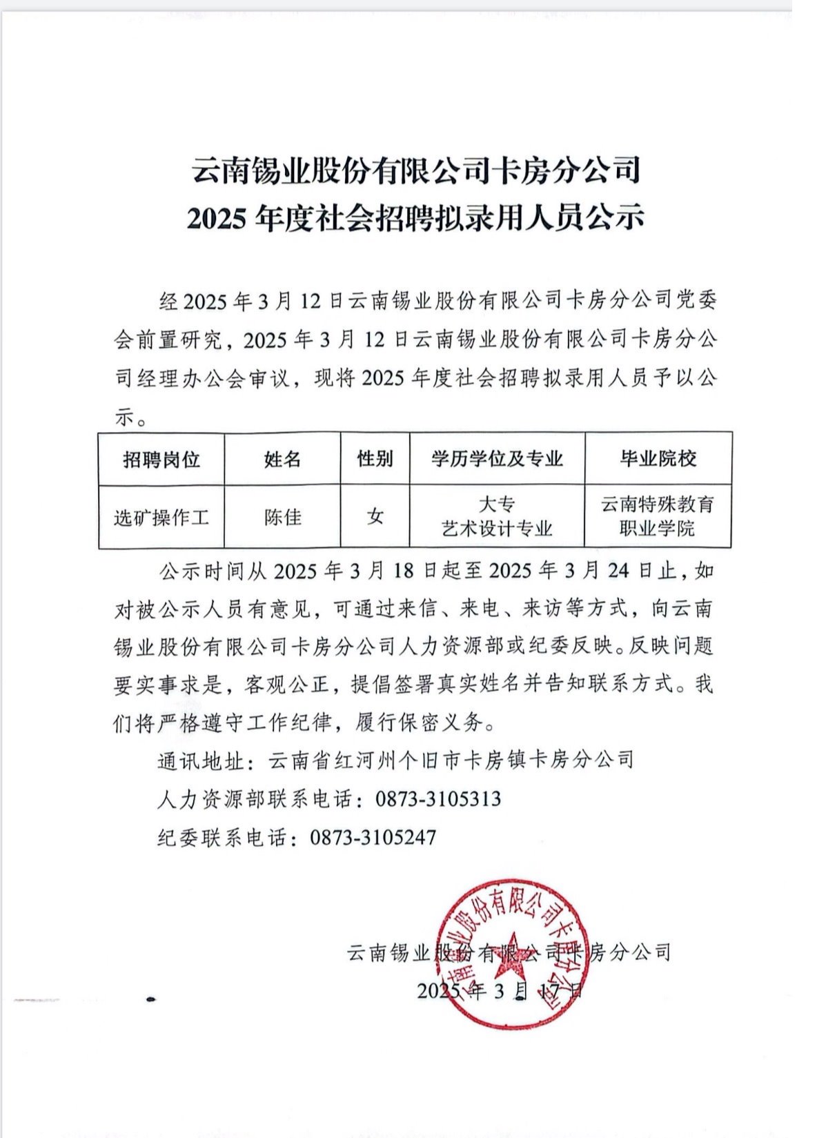 云南錫業股份有限公司卡房分公司2025年度社會招聘擬錄用人員公示