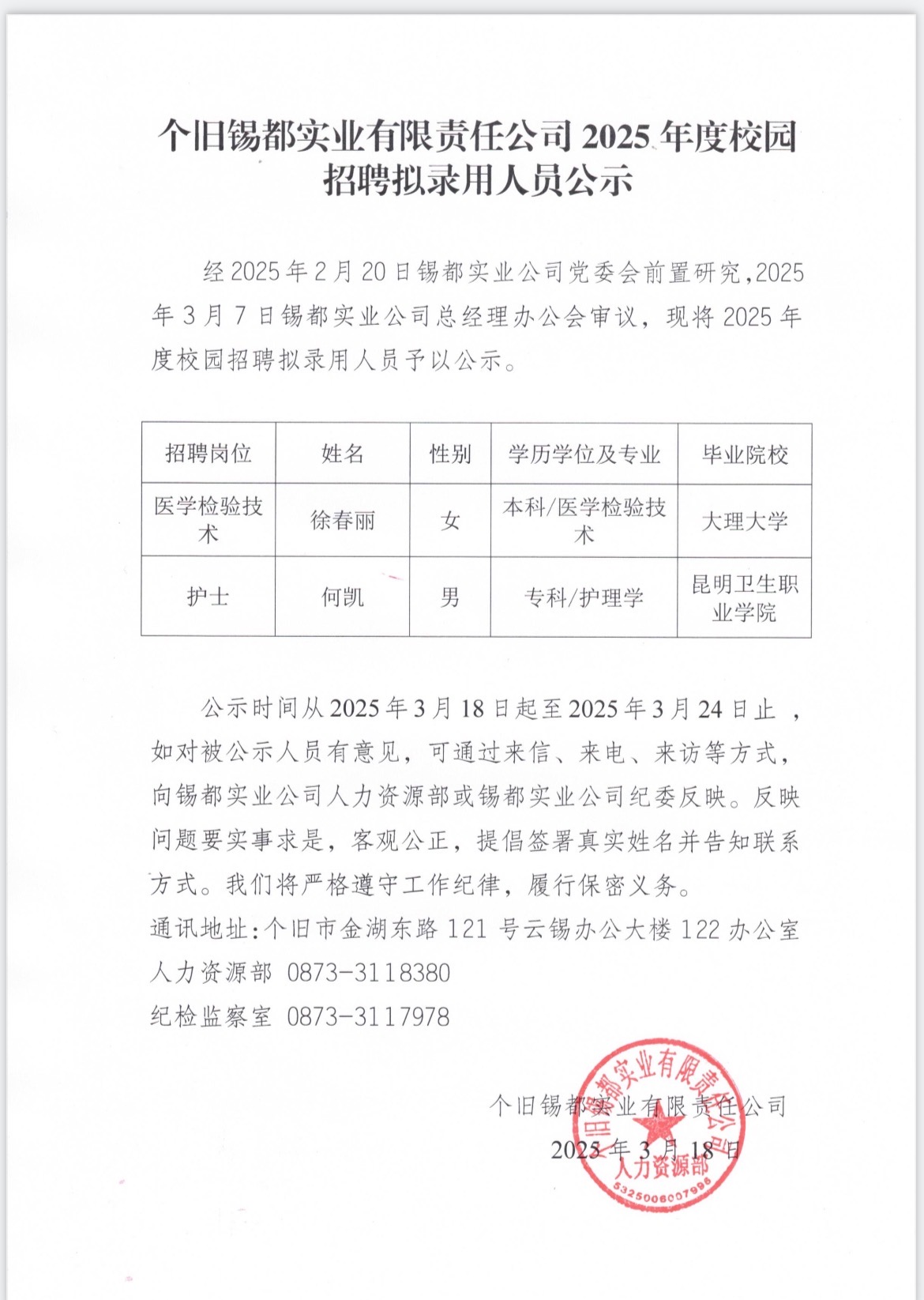個舊錫都實業有限責任公司2025年度校園招聘擬錄用人員公示