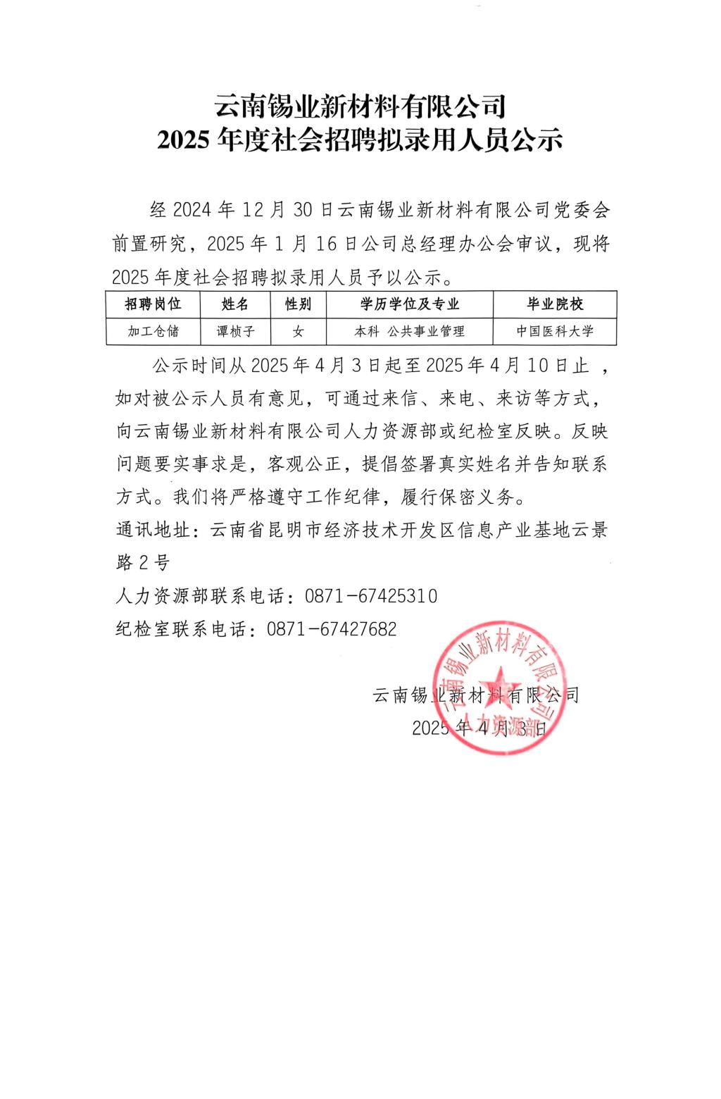 云南錫業(yè)新材料有限公司2025年度社會(huì)招聘擬錄用人員公示